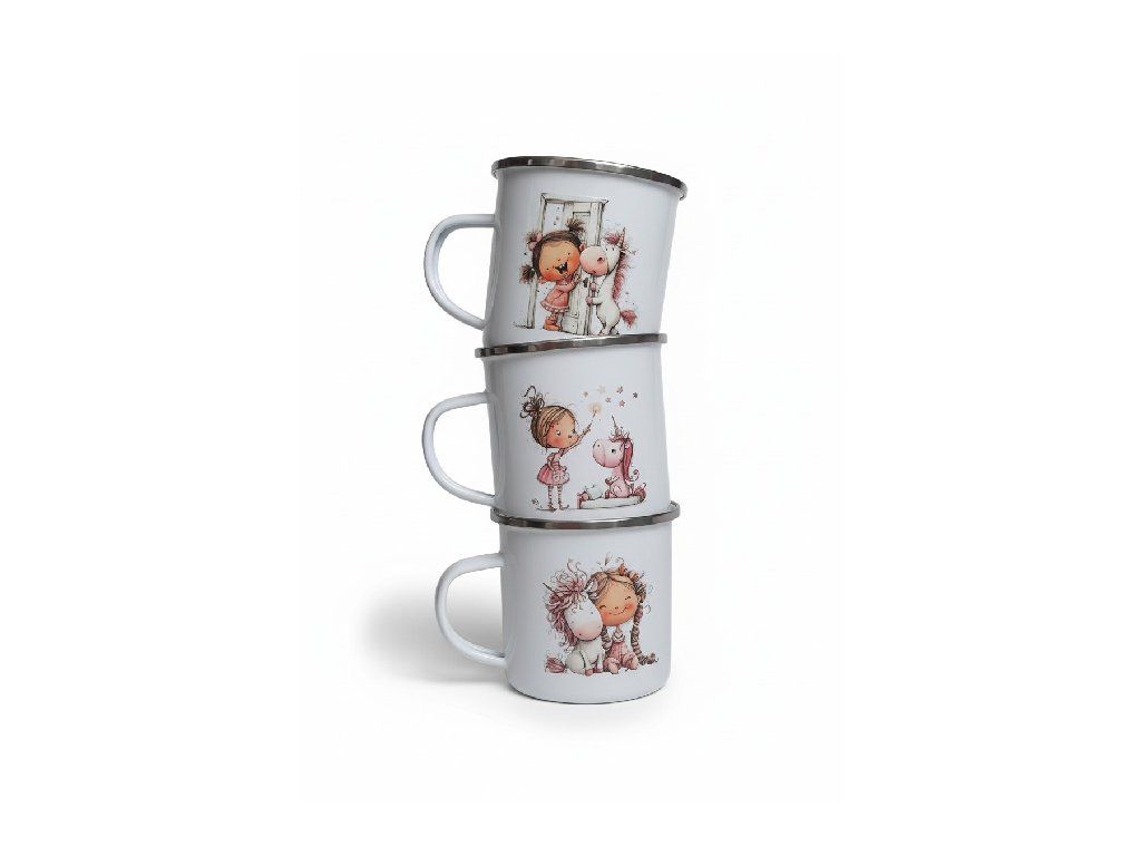 Roztomilý dětský oboustranný plecháček s jemným ilustrativním motivem potěší každé dítě i milovníky něžného stylu. Hrnek zdobí krásné kresby holčiček a pohádkových jednorožců v pastelových tónech, které působí hravě a zároveň uklidňujícím dojmem. Díky lehkému, ale odolnému smaltovanému provedení je ideální na doma, na výlety i do školky.