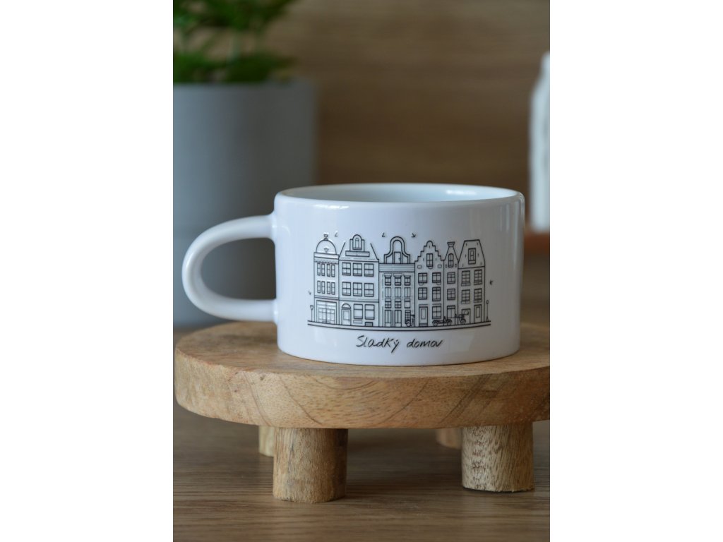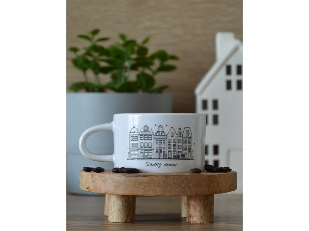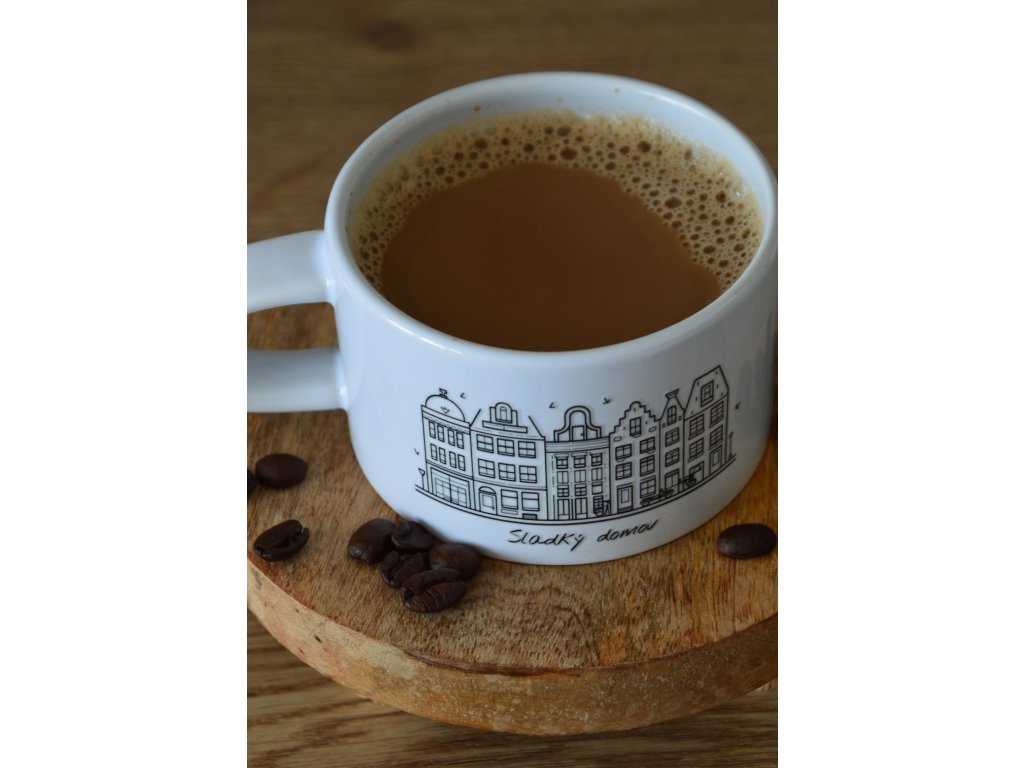 Dopřejte si chvilku pohody s hrníčkem „makronka“ o objemu 200 ml. Bílý hrnek zdobí originální kresba městských domků a nápis Sladký domov, který dodá každému doušku kávy nebo čaje útulnou atmosféru.