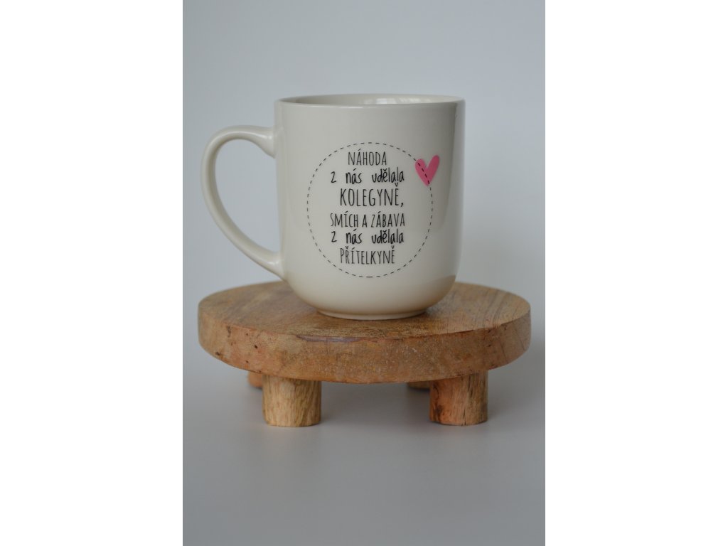 Vysoký hrnek o objemu 300 ml s nápisem „Náhoda z nás udělala kolegyně, smích a zábava z nás udělala přítelkyně“ je krásným a originálním dárkem pro kolegyni, která je zároveň blízkou kamarádkou. Hrníček spojuje praktičnost a osobní vzkaz, díky čemuž potěší při každém šálku oblíbené kávy nebo čaje.